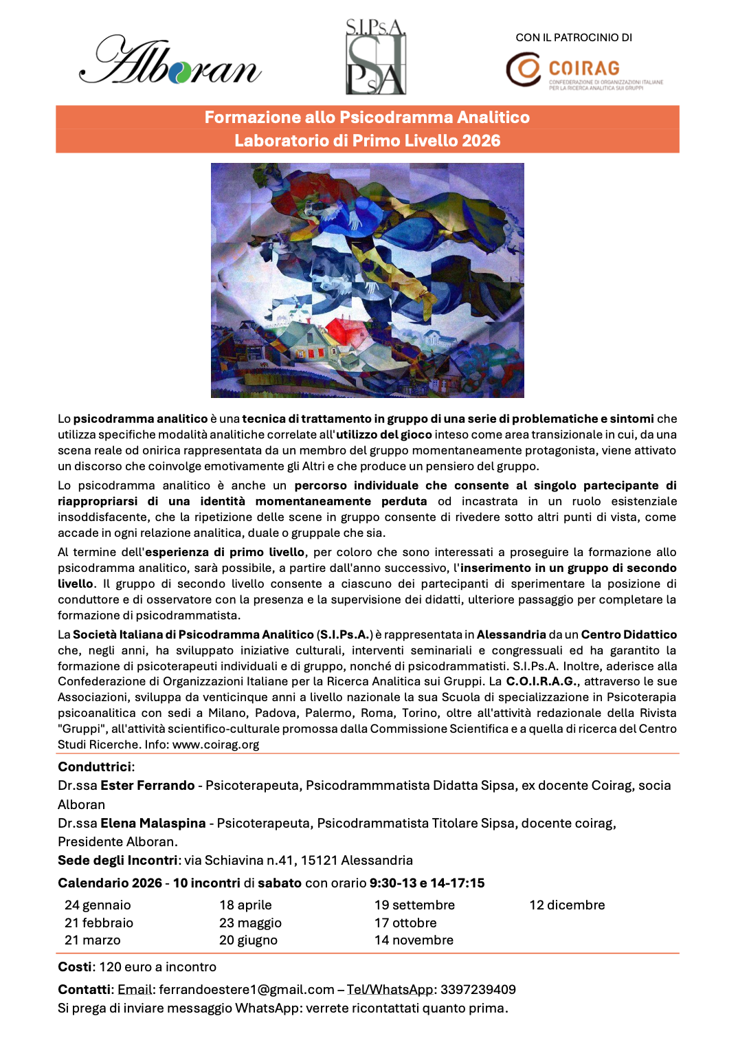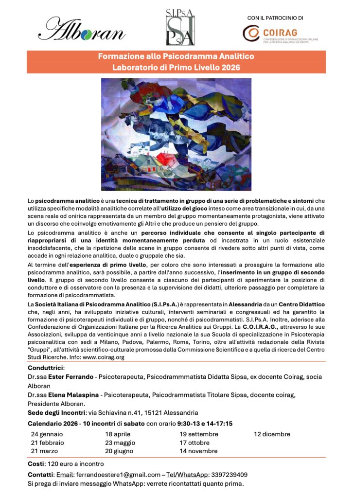 La Società Italiana di Psicodramma Analitico (S.I.Ps.A.) è rappresentata in Alessandria da un Centro Didattico che, negli anni, ha sviluppato iniziative culturali, interventi seminariali e congressuali ed ha garantito la formazione di psicoterapeuti individuali e di gruppo, nonché di psicodrammatisti. S.I.Ps.A. Inoltre, aderisce alla Confederazione di Organizzazioni Italiane per la Ricerca Analitica sui Gruppi. La C.O.I.R.A.G., attraverso le sue Associazioni, sviluppa da venticinque anni a livello nazionale la sua Scuola di specializzazione in Psicoterapia psicoanalitica con sedi a Milano, Padova, Palermo, Roma, Torino, oltre all’attività redazionale della Rivista “Gruppi”, all’attività scientifico-culturale promossa dalla Commissione Scientifica e a quella di ricerca del Centro Studi Ricerche. Info: www.coirag.org.