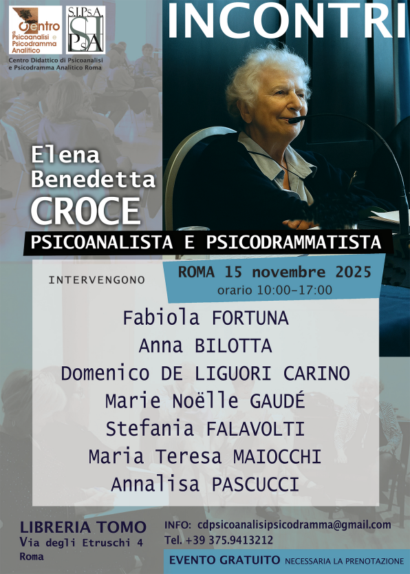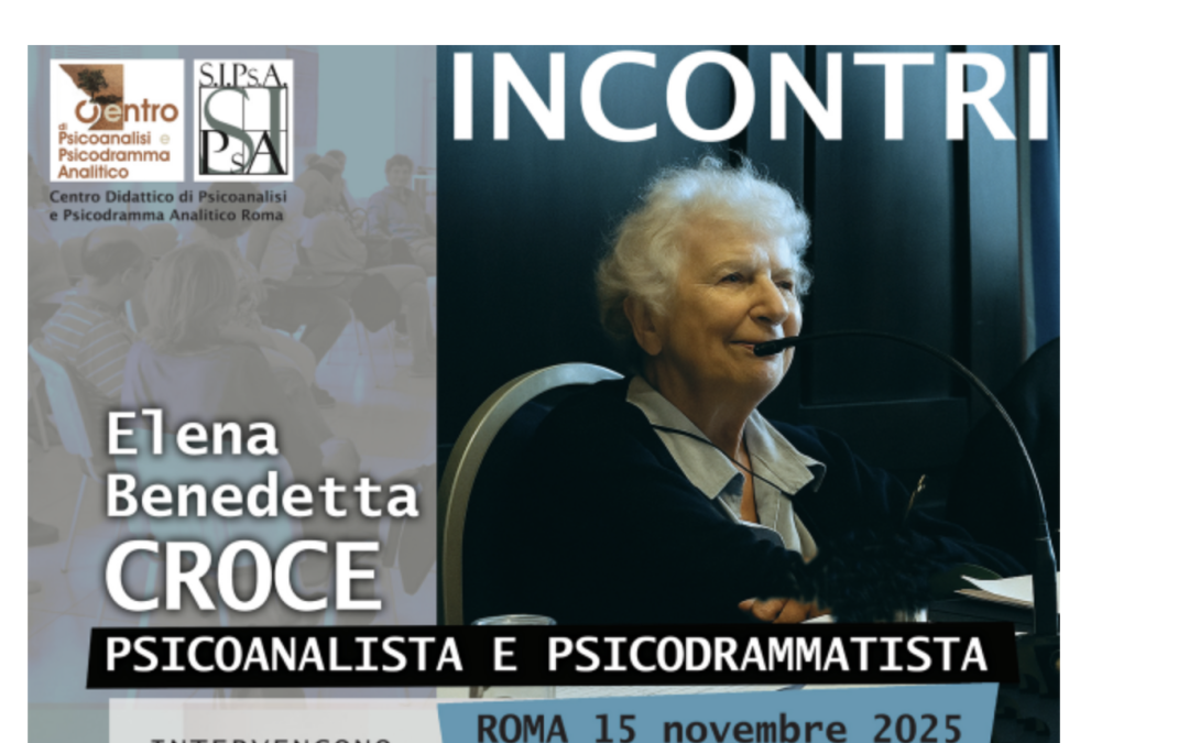 Il 15 Novembre 2025 dalle ore 10.00 alle ore 17.00, SIPsA organizza una giornata dedicata ad approfondire la conoscenza di Elena Benedetta Croce, Psicoanalista e Psicodrammatista, attraverso i ricordi e le testimonianze di chi l’ha conosciuta.