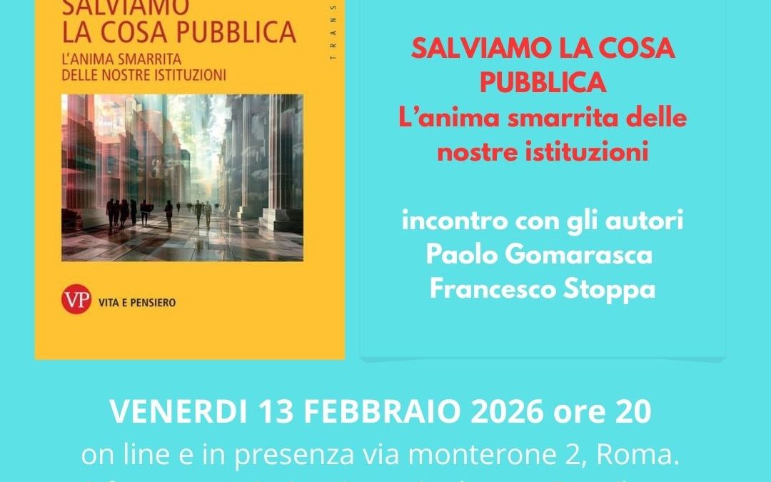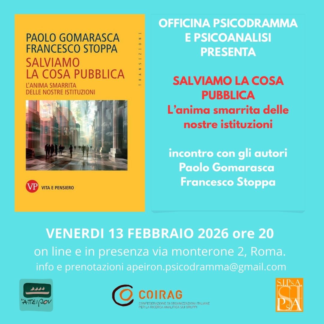 Apeiron Associazione e Centro Didattico SIPsA ETS con il patrocinio COIRAG propongono all’interno del ciclo di seminario Officina Psicodramma e Psicoanalisi l’incontro con gli autori del libro dal titolo: “Salviamo la cosa pubblica. L’anima smarrita delle nostre istituzioni”, Paolo Gomarasca e Francesco Stoppa, previsto per Venerdì 13 Febbraio 2026, presso Via Monterone 2, Roma e online.