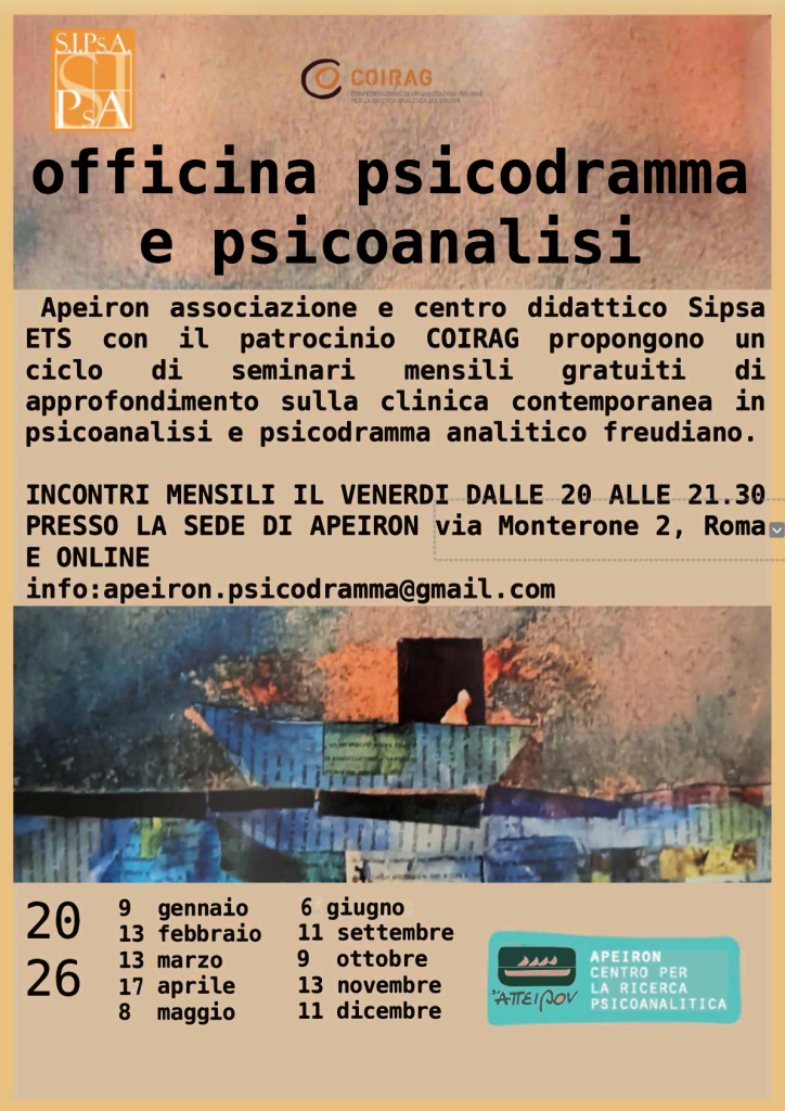 Il Centro Didattico Apeiron di SIPsA con il patrocinio COIRAG propone un ciclo di seminari mensili gratuiti di approfondimento sulla clinica contemporanea in Psicoanalisi e Psicodramma Analitico freudiano, dal titolo: “Officina Psicodramma e Psicoanalisi”.